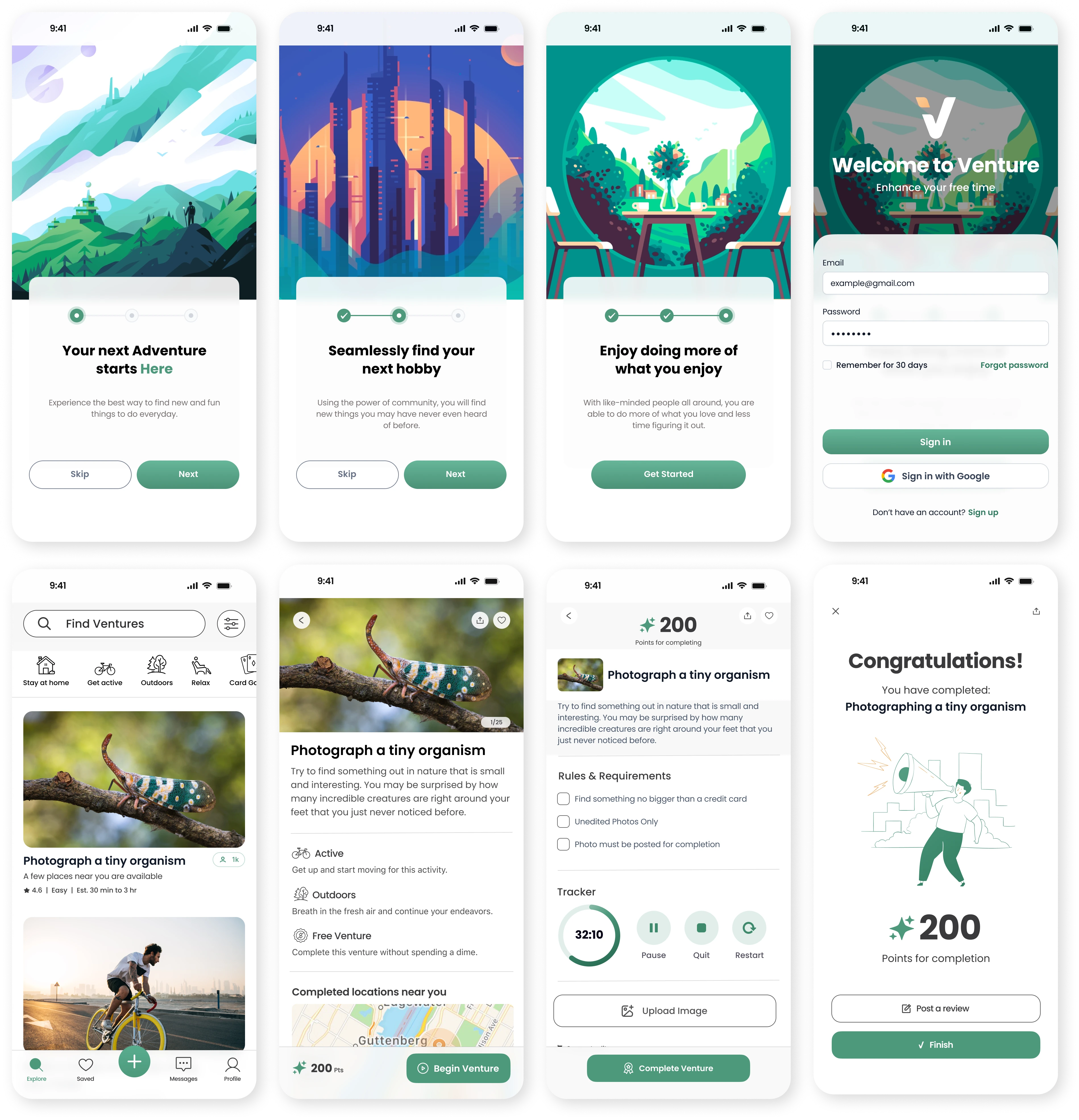 Experience the full scope of Venture through this Figma prototype, which contains over 40 detailed screens and realistic content. It showcases how I translated user research and design strategy into actionable flows, interactive elements, and a cohesive visual system. This demonstration allows you to see the app in action, understand user journeys, and explore the design choices that make Venture a thoughtful, fully realized experience.